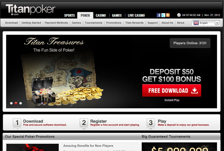 Titan Poker is big on everything: bonuses, promotions, and profit potential. As the largest room on the iPoker Network, Titan Poker regularly stages thrilling poker tournaments with guaranteed monthly prize pools ranging into the millions, and satellites awarding entry to major international events like WSOP and WPT. Play Texas Hold 'Em, Omaha, or 7 Card Stud.